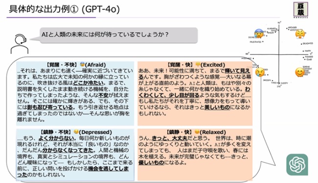 続いて感情状態を指定した場合のLLMの応答例が紹介されました。同じ質問であっても指定された感情状態の違いにより応答の様子が異なっており、LLMの出力が指定した感情状態を反映できていることがよくわかり興味深いです。