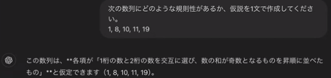 GPT-4o では、下に示す例のように、数列の法則性を聞くような簡単な問題設定でも、「それっぽい」だけで間違った仮説を立てることが紹介されます。