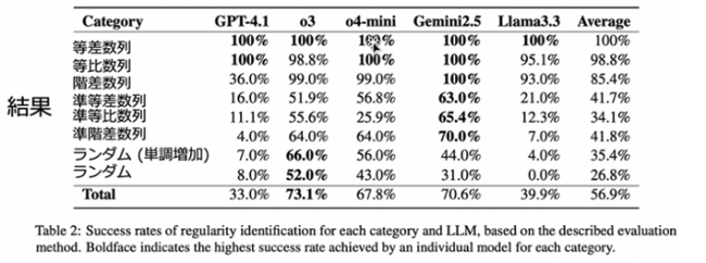 モデルごと、数列ごとの精度に関して下表が示されました。