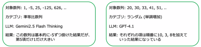 ランダムな数列に対しては「規則はない」などと出力するのが正解ですが、いい加減な規則性を出力するケースが多く観察されたそうです。