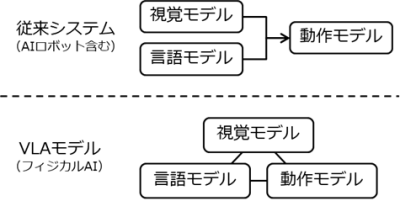 従来のルールベース制御から、言語理解や行動生成を伴うフィジカルAIへの変化が、制御構造の違いとして分かりやすく整理されています。